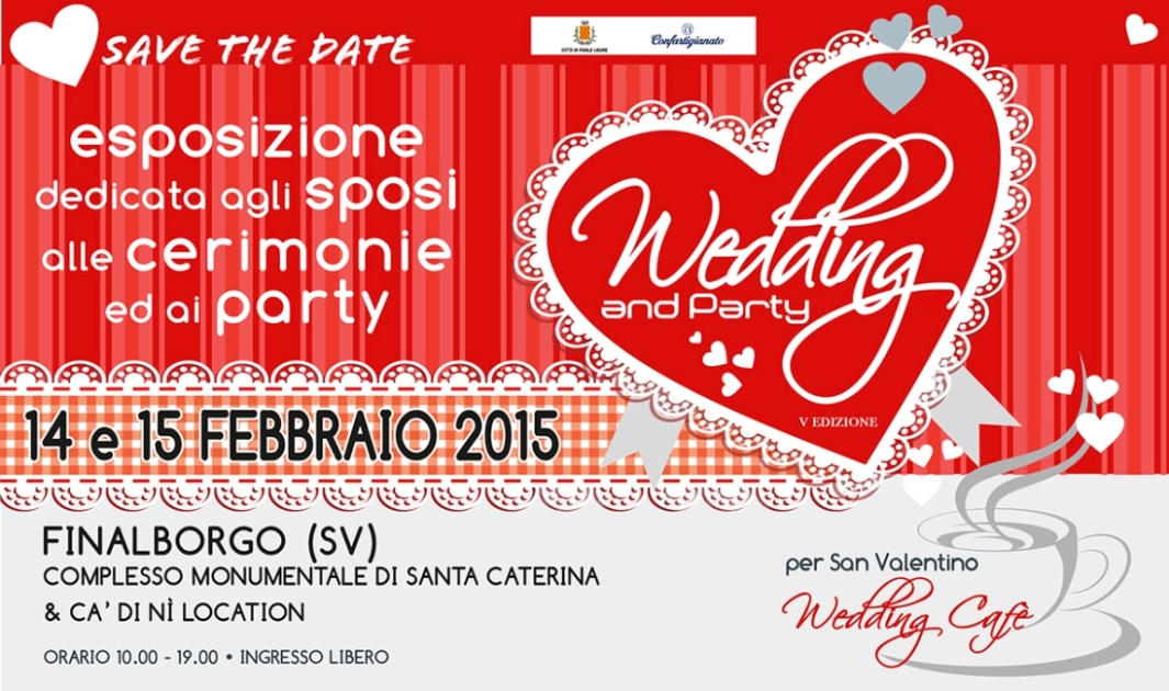 Febbraio, con San Valentino, si qualifica il mese dell’amore, Cupido scaglia le sue frecce e fa nascere amori che, a volte, portano al grande si: il matrimonio. Ecco perché ogni febbraio torna l’appuntamento con Wedding & Party, l’evento dedicato agli sposi, alle cerimonie e alle feste, con la collaborazione di Confartigianato Liguria nell’ambito delle azioni dedicate alla promozione del sito “Matrimoni e Cerimonie in Liguria” www.cerimonieinliguria.it. Non solo matrimoni e anniversari anche feste di laurea o di compleanno ed eventi di lavoro o di promozione aziendale. La cornice è uno dei borghi più belli d’Italia, Finalborgo, in due magnifiche location dove vengono organizzati eventi: il Complesso Monumentale di Santa Caterina e Ca’ di Nì. Le giornate sono il 14 e il 15 febbraio e sono ricche di appuntamenti: gli scatti del giorno più bello, idee per il buffet del matrimonio o di dolci per le feste, le bomboniere, le colonne sonore più adatte per ogni occasione, i brindisi e le torte e... per il giorno di San Valentino vi aspetta il Wedding Caffé.